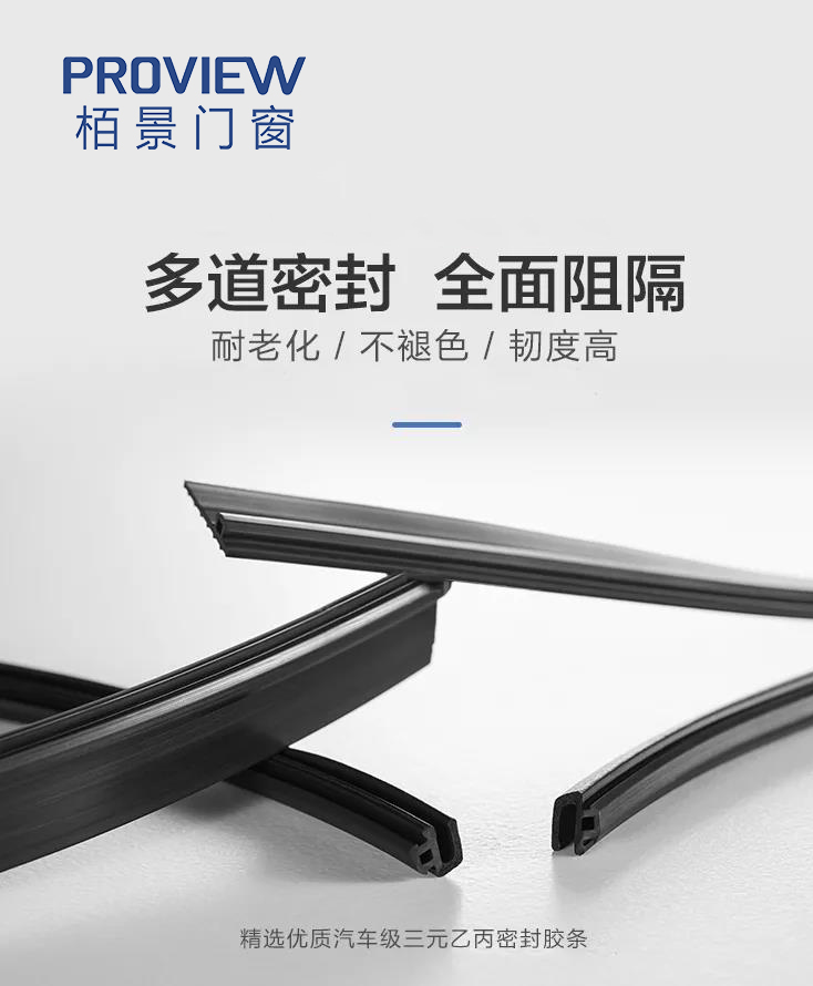 栢景系統(tǒng)門窗精選優(yōu)質(zhì)汽車級EPDM發(fā)泡膠條進(jìn)行密封,膠條是壓入式的;連接型材的隔熱條在同一條直線上,形成了一個完成的隔熱層(等溫線層),有效達(dá)到冬季保溫的效果。