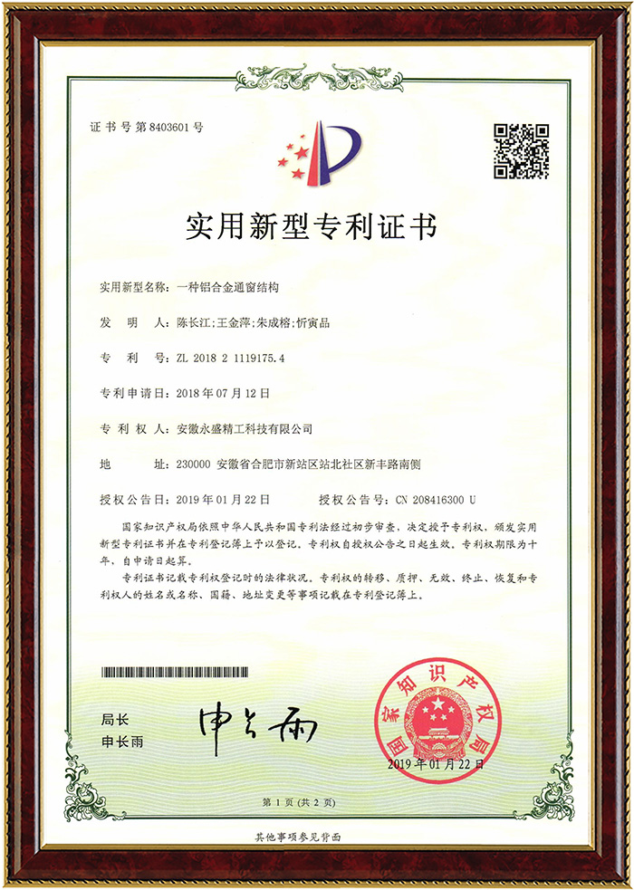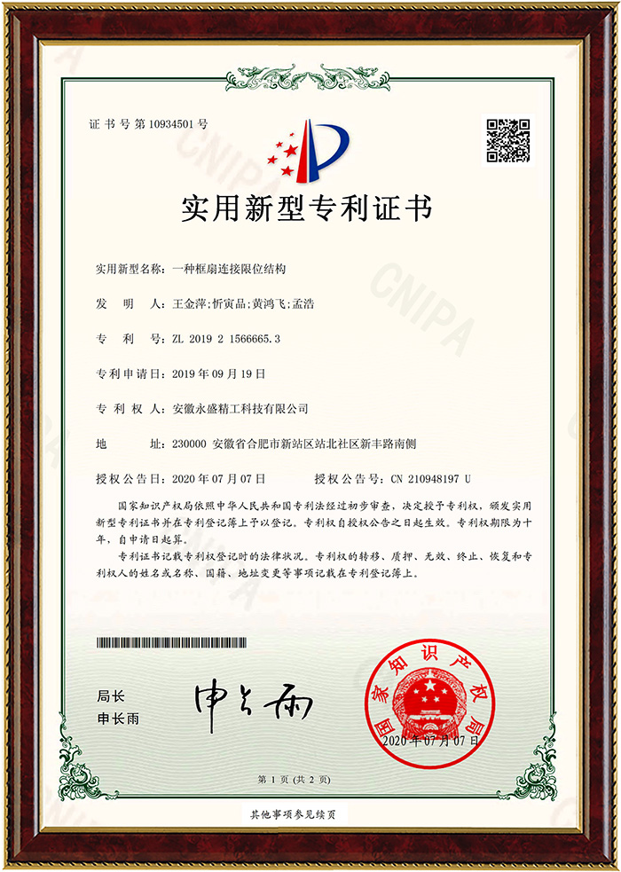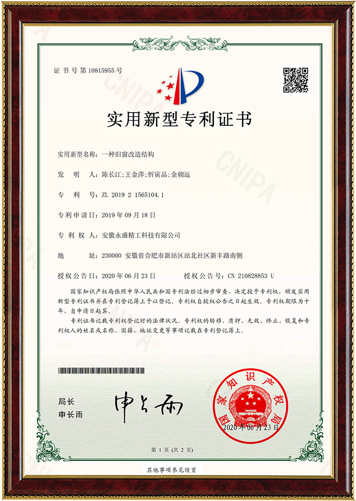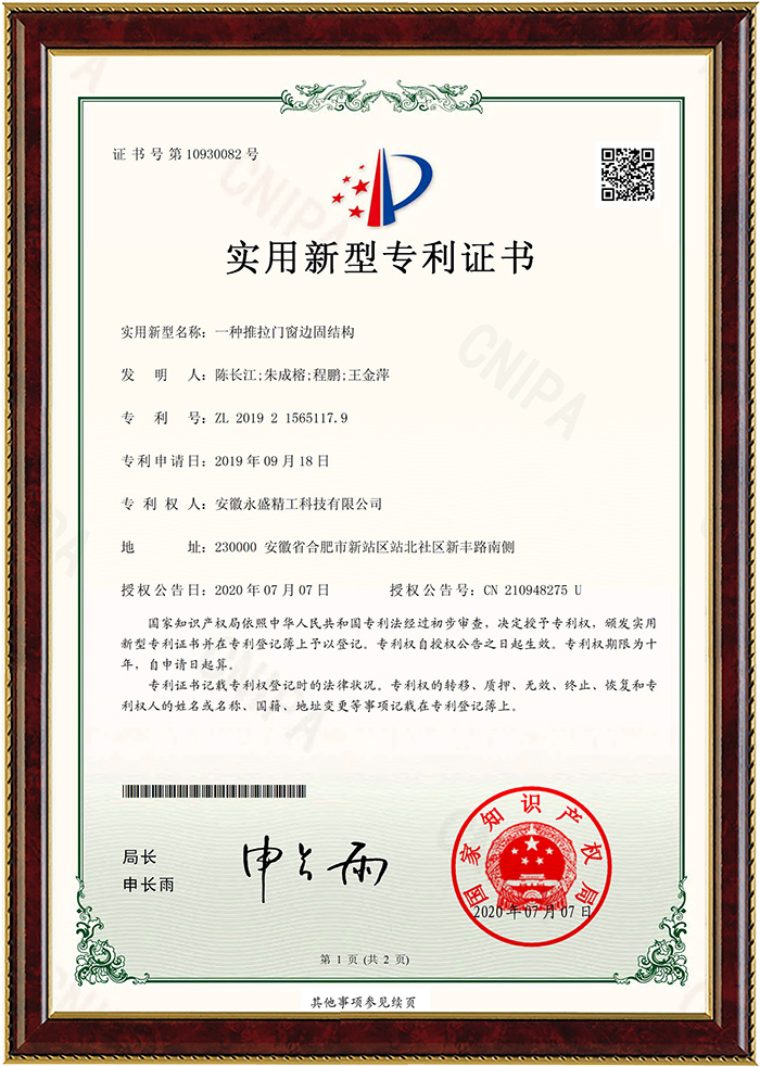榮耀證明實力,品質(zhì)贏得口碑。永盛始終踐行"匠心質(zhì)造"的精神,技術(shù)創(chuàng)新一直被視作永盛門窗的核心競爭力,針對客戶需求開展有針對性的產(chǎn)品研發(fā),在線擁有多項國家專利。